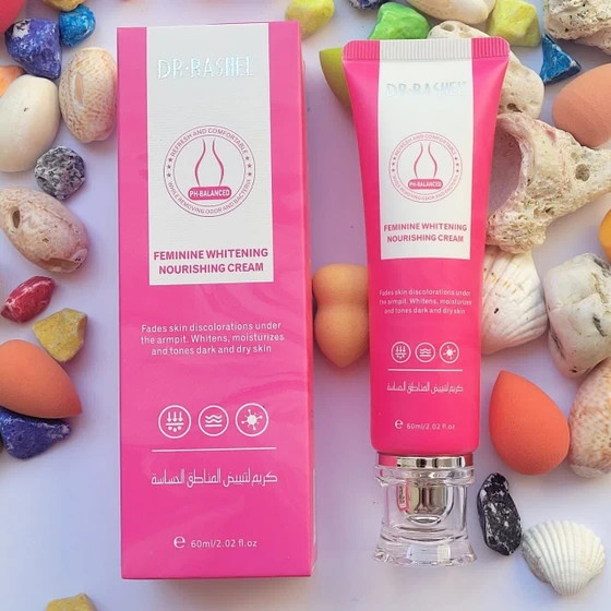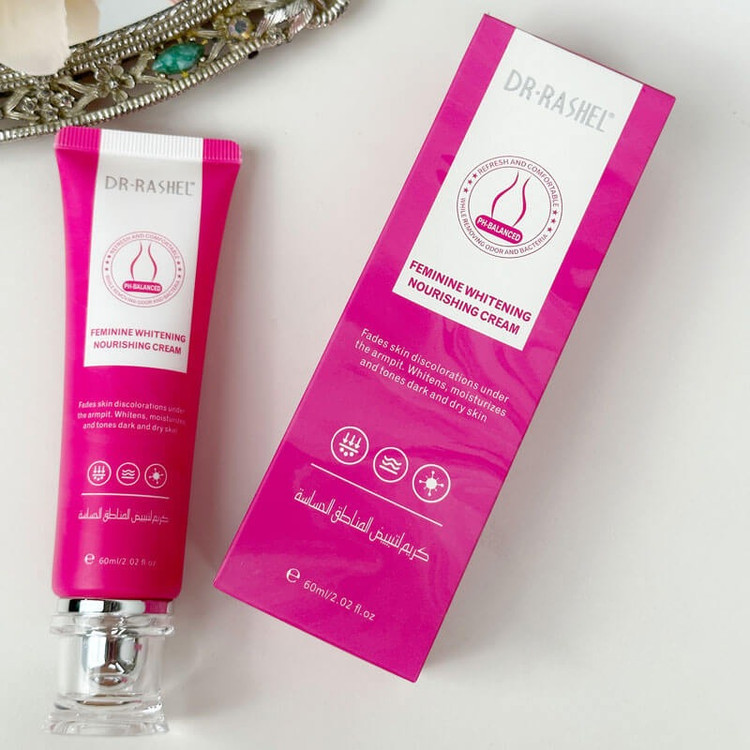 این تصویر یک کرم سفیدکننده و مغذی زنانه (Feminine Whitening Nourishing Cream) را نشان میدهد که برای روشن کردن و بهبود وضعیت پوست نواحی حساس بدن طراحی شده است.